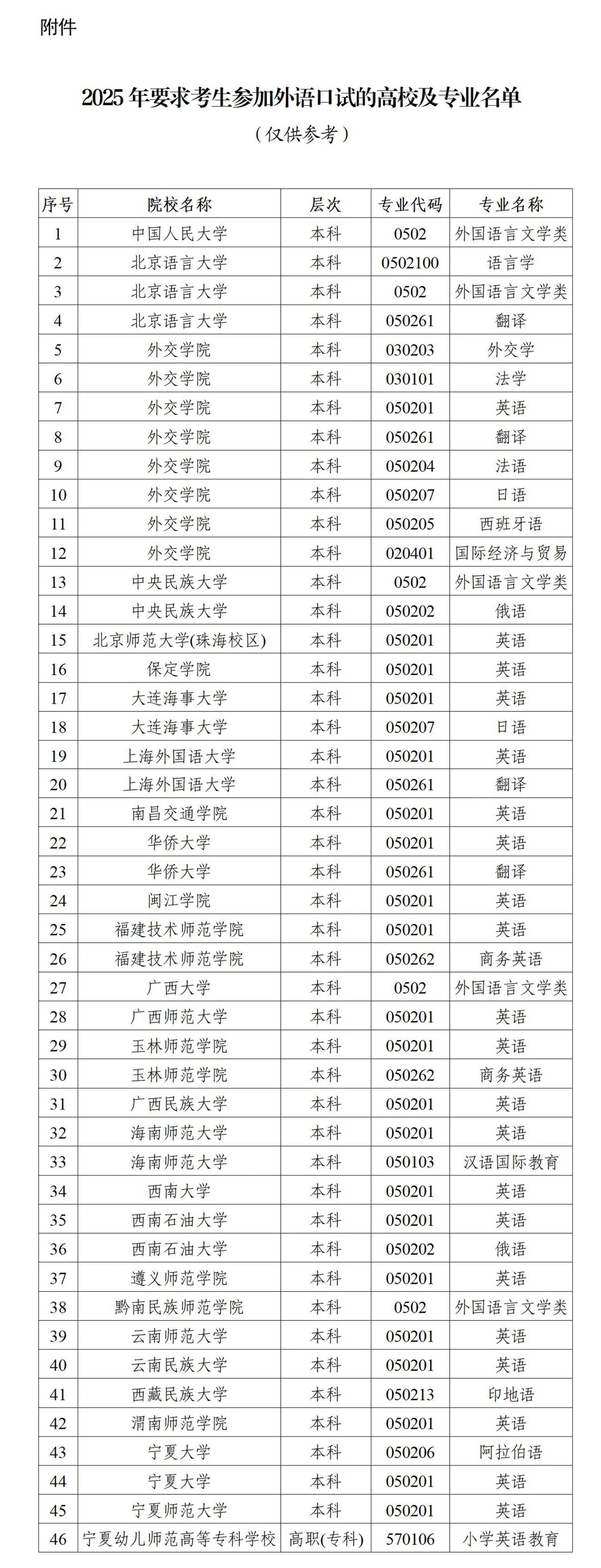 报考外语专业及其他要求外语口试专业的考生,除参加高考统考外,还应参加外语口试。报考对外语口试不作要求的专业,考生无需参加外语口试。2025年对外语口试有要求的高校及专业见附件,供考生参考。